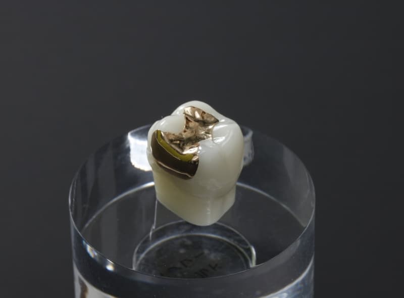 金(ゴールド)を主成分とした貴金属合金でできています。歯科用で使われている様々な金合金の中でもパラジウムフリーの素材を使い、身体にやさしい成分となっています。金属なので強度があります。
