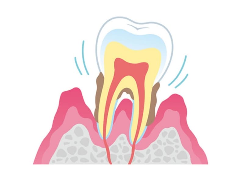 歯周病は、歯垢に含まれる細菌が歯周組織に感染し、炎症を起こす病気です。歯周病が進行すると、歯ぐきが腫れ、歯と歯ぐきの間に隙間(歯周ポケット)ができて、細菌や食べかすが溜まりやすくなります。歯周ポケットに溜まった細菌や食べかすは、歯周病菌を増殖させ、歯周組織の炎症を悪化させます。歯周病を放置すると、歯ぐきが後退し、歯がグラグラになってきます。さらに進行すると、歯が抜けてしまうこともあります。